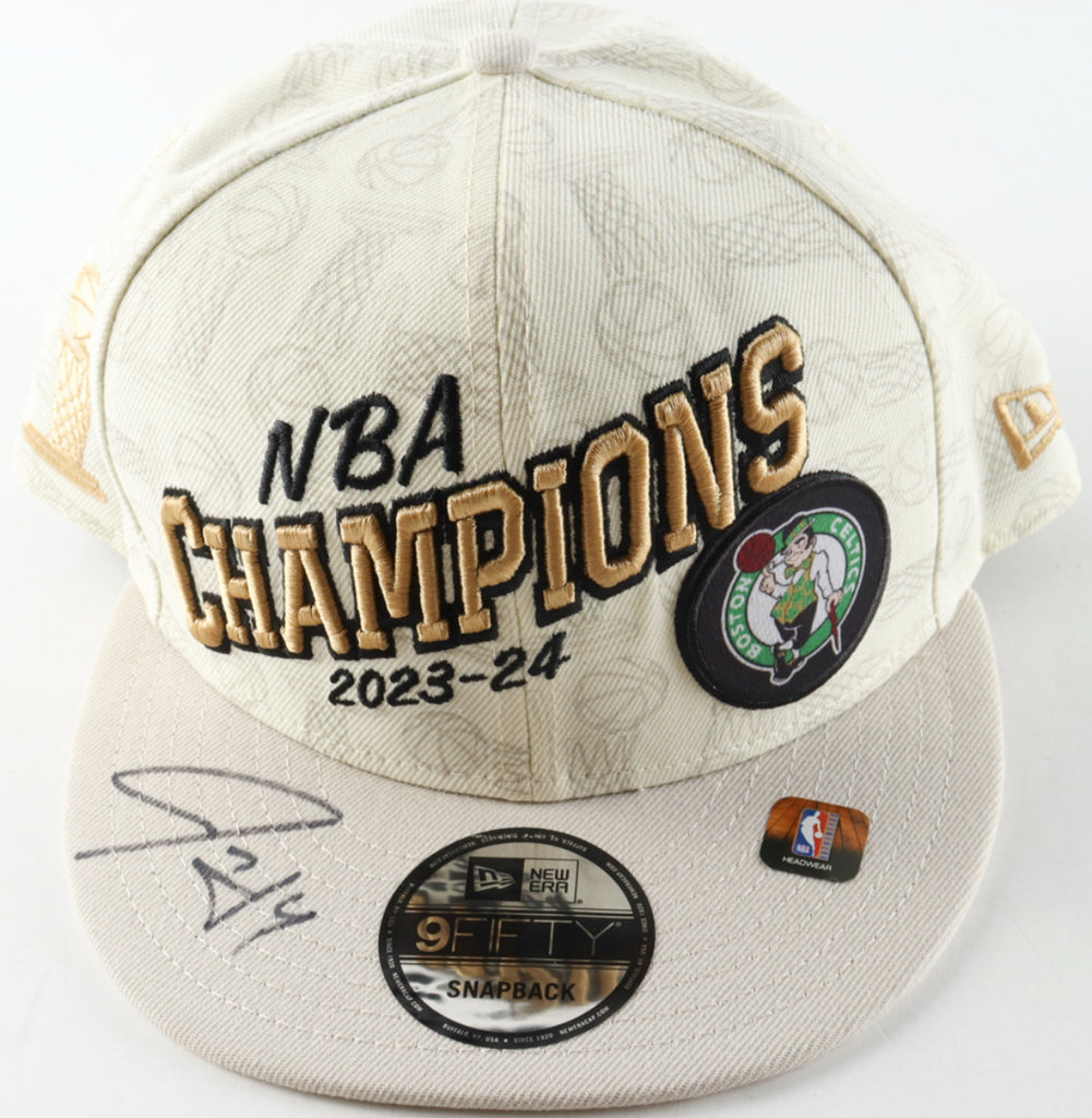 New Era Boston Celtics 2023-24 NBA Champion adjustable hat. Hand-signed by Jrue Holiday.